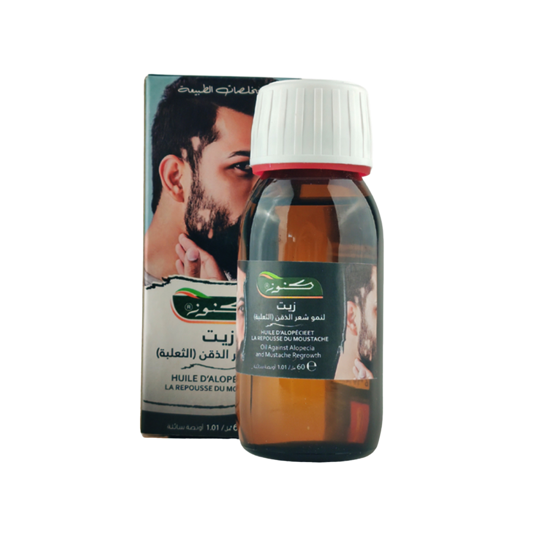KOUNOUZ Alopecia Oil is a natural treatment specifically designed to stimulate the growth of beard and mustache hair and promote hair growth in sparse areas of the scalp, eyebrows, and eyelashes. Its unique blend of natural and essential oils deeply nourishes hair follicles, strengthens existing hair, and helps densify areas with weak or uneven growth.