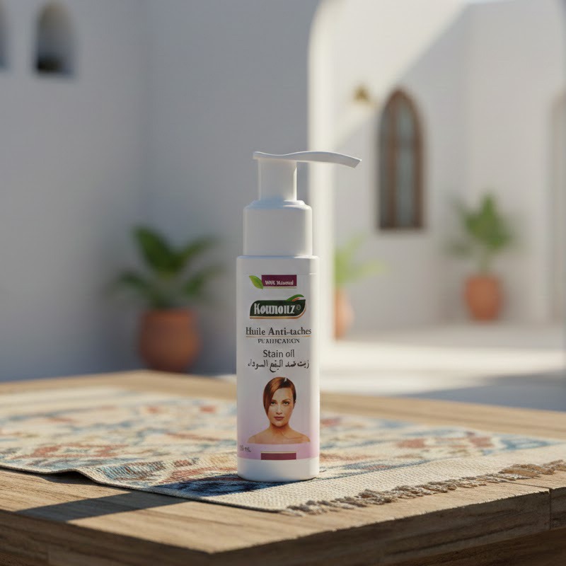 The KOUNOUZ Anti-STAIN Oil is a natural treatment designed to reduce, prevent, and eliminate pigmentation spots while brightening the complexion and regenerating the skin. For optimal results, apply a few drops to clean skin and massage gently in circular motions for 1 to 2 minutes. This treatment is recommended for evening use only, and direct sun exposure should be avoided during its application. The minimum recommended duration to achieve visible results is three months. Avoid contact with the eyes, and it is advised to wash the face in the morning with cold water and a cleanser suited to your skin type. Its natural formula combines argan oil, sweet almond oil, and brightening essential oils such as orange and lavender, offering a powerful blend to nourish, protect, and even out the complexion. Available in a 50 ml bottle, the KOUNOUZ Anti-Spot Oil is an essential ally for radiant, smooth, and visibly rejuvenated skin.