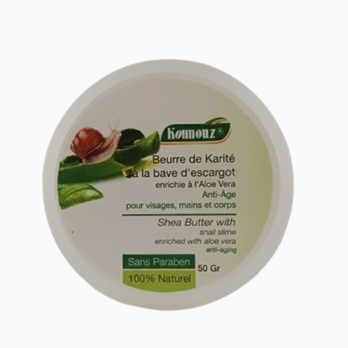 Le baume au beurre de karité à la bave d’escargot Anti-Âge KOUNOUZ est un soin de luxe pour le visage, adapté à tous types de peaux. 100 % naturel, il possède des propriétés régénérantes, réparatrices et assouplissantes : il nourrit en profondeur, participe au renouvellement cellulaire, lisse les rides récentes et prévient leur apparition. Il aide également à estomper cicatrices, brûlures, taches pigmentaires, vergetures et rides, tout en offrant une hydratation optimale et un effet antioxydant. Associé à l’aloe vera, il renforce encore plus l’hydratation et la réparation de la peau.