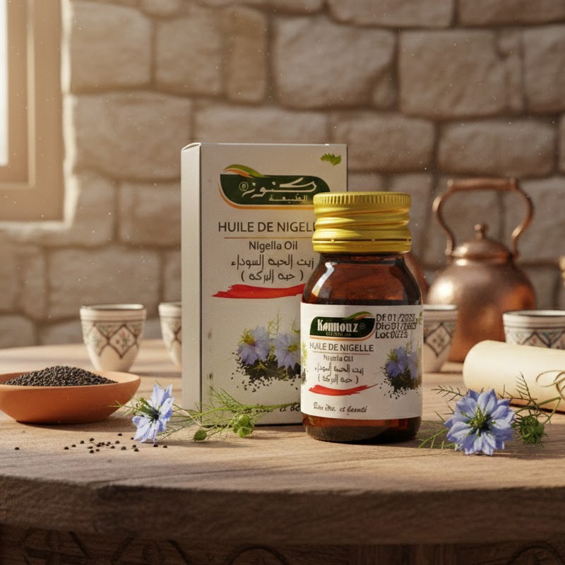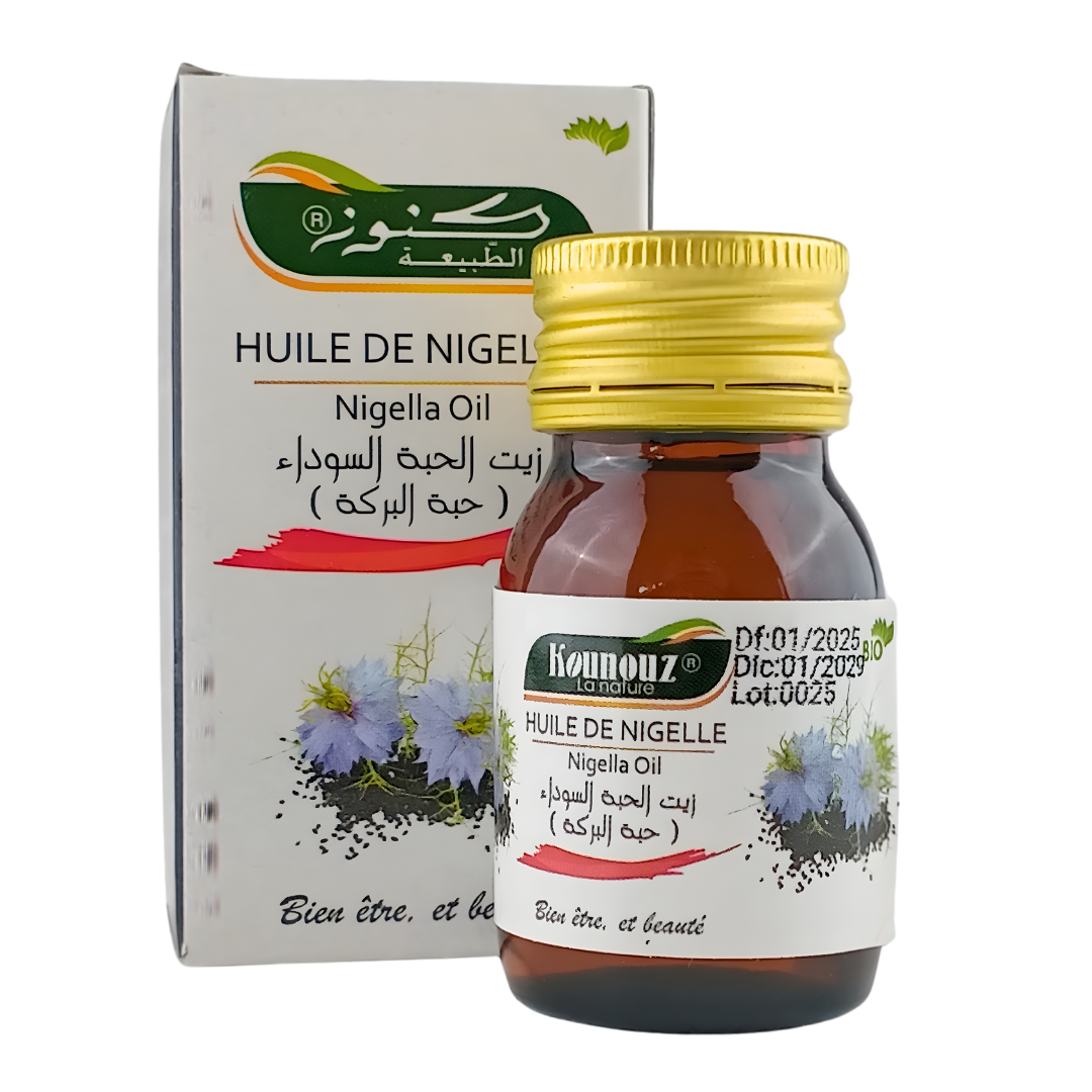KOUNOUZ Black Seed Oil (Nigella Oil) is a true natural treasure with multiple virtues, recognized for centuries for its exceptional benefits for health, skin, and hair. Known as the “remedy for all ailments except death” according to the teachings of the Prophet Muhammad, it helps restore daily energy and vitality while promoting overall well-being. When applied to the skin, it purifies and cleanses the epidermis, soothes irritations, eczema, sunburn, and minor burns, while providing hydration and comfort to sensitive skin.