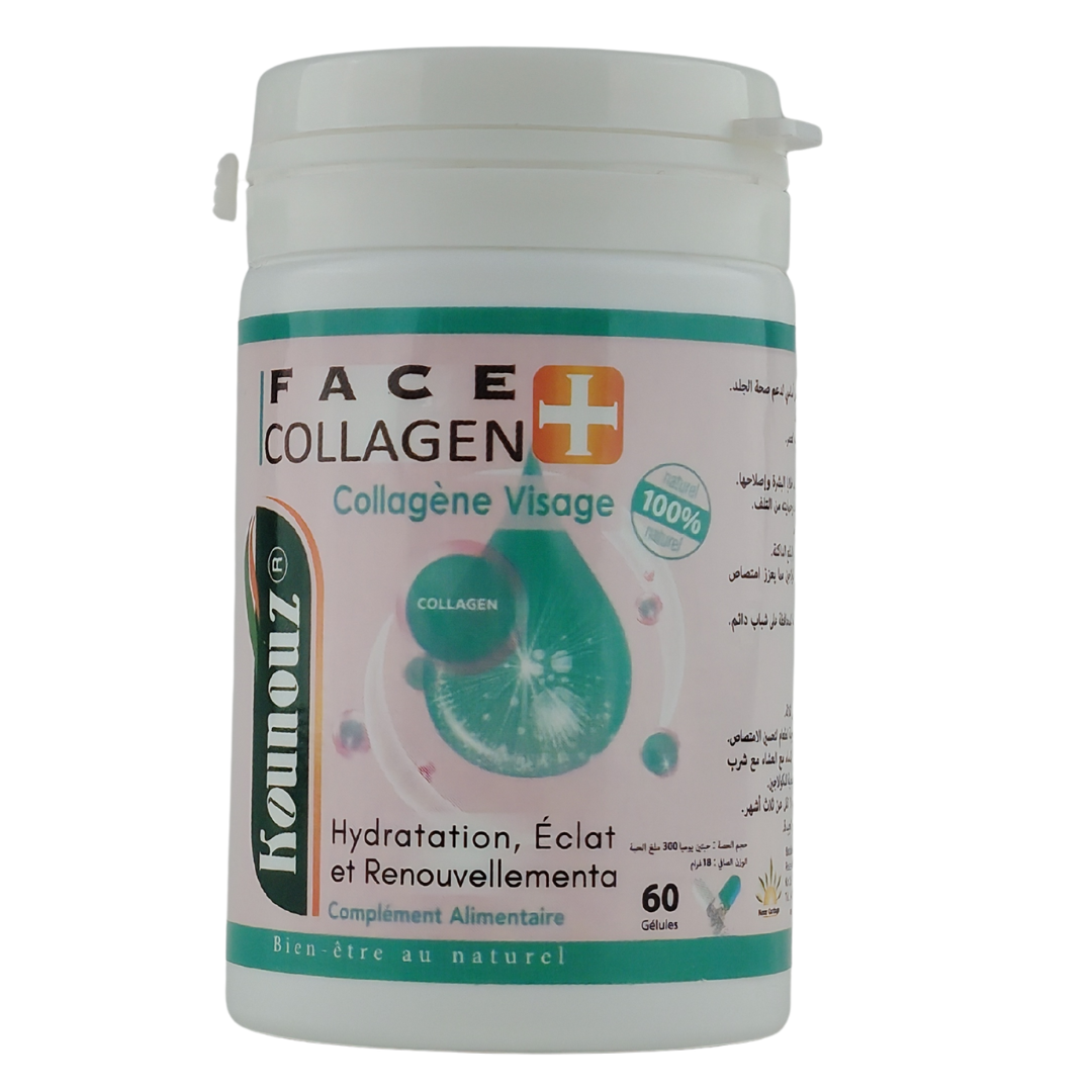 Le complément alimentaire Face Collagen de KOUNOUZ soutient l’hydratation, l’éclat et le renouvellement de la peau. En stimulant la production naturelle de collagène, il aide à améliorer l’élasticité, réduire les rides et raviver l’éclat naturel du visage pour une peau visiblement plus jeune et lumineuse.