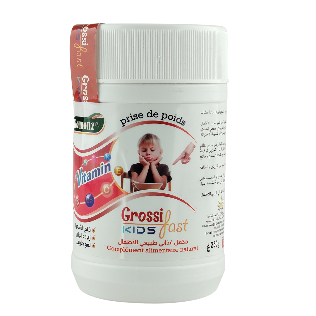 Grossi Kids KOUNOUZ est un complément nutritionnel spécialement formulé pour favoriser une prise de poids saine et un développement optimal chez les enfants. Sa formule contient un équilibre idéal de graisses saines, de protéines, de vitamines et de minéraux, essentiels pour la croissance, la concentration et le renforcement du système immunitaire. Ce complément agit également comme stimulant de l’appétit, grâce à ses ingrédients naturels soigneusement sélectionnés, adaptés aux enfants souffrant de retard de croissance ou ayant des besoins nutritionnels accrus.