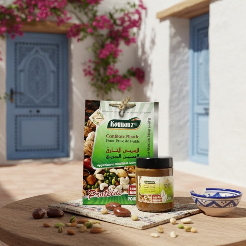 Le complément protéiné Prise de Poids KOUNOUZ favorise une prise de poids progressive et équilibrée grâce à sa formule exclusive à base de fruits secs, ginseng, un peu de fenugrec et des herbes riches en oméga 3 et 6. Il stimule l’appétit, soutient les défenses naturelles, apporte énergie et vitalité tout au long de la journée, tout en préservant votre capital jeunesse et santé.