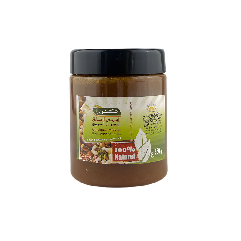 KOUNOUZ Miracle Weight Gain Jam is a natural supplement designed to support gradual, healthy, and balanced weight gain. Its exclusive blend of dried fruits, ginseng, fenugreek, and herbs rich in Omega-3 and Omega-6 naturally enhances appetite and promotes better energy. In addition to supporting weight gain, it helps strengthen natural defenses and quickly restores vitality and energy throughout the day.