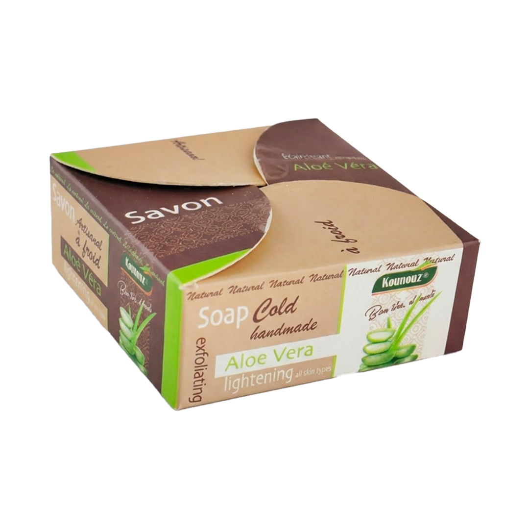 Le savon artisanal à froid à l’Aloe Vera “éclaircissant” de KOUNOUZ est un savon naturel qui nettoie en douceur, hydrate la peau et contribue à un teint lumineux et uniforme, grâce aux propriétés apaisantes et régénérantes de l’Aloe Vera.