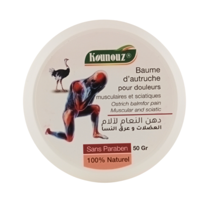 Le Baume d’Autruche Kounouz est un baume de massage naturel efficace pour soulager les douleurs musculaires et articulaires, les courbatures, les céphalées, l’arthrose, les sciatiques et les migraines. Il apaise également les piqûres d’insectes et les démangeaisons, offrant un soin polyvalent et apaisant grâce à l’expertise Kounouz dans les produits naturels à base de plantes médicinales depuis 2007.