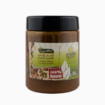 مربى المعجزة لزيادة الوزن من كنوز هو مكمل طبيعي مُصمم للمساعدة على زيادة الوزن بشكل تدريجي، صحي ومتوازن. بفضل تركيبته الحصرية من الفواكه المجففة، الجنسنغ، الحلبة والأعشاب الغنية بأوميغا 3 و6، فهو يعزز الشهية بشكل طبيعي ويدعم الحصول على طاقة أفضل. بالإضافة إلى دعم زيادة الوزن، يساهم في تقوية الدفاعات الطبيعية واستعادة الحيوية والطاقة بسرعة طوال اليوم.